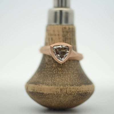 "Looking for an engagement ring that truly stands apart? This handcrafted Arris ring features a stunning Curved Trillian cognac diamond set in 18ct rose gold - designed for those who value individuality over convention. Each piece is made to order in our London workshop, ensuring your ring is as unique as your story."