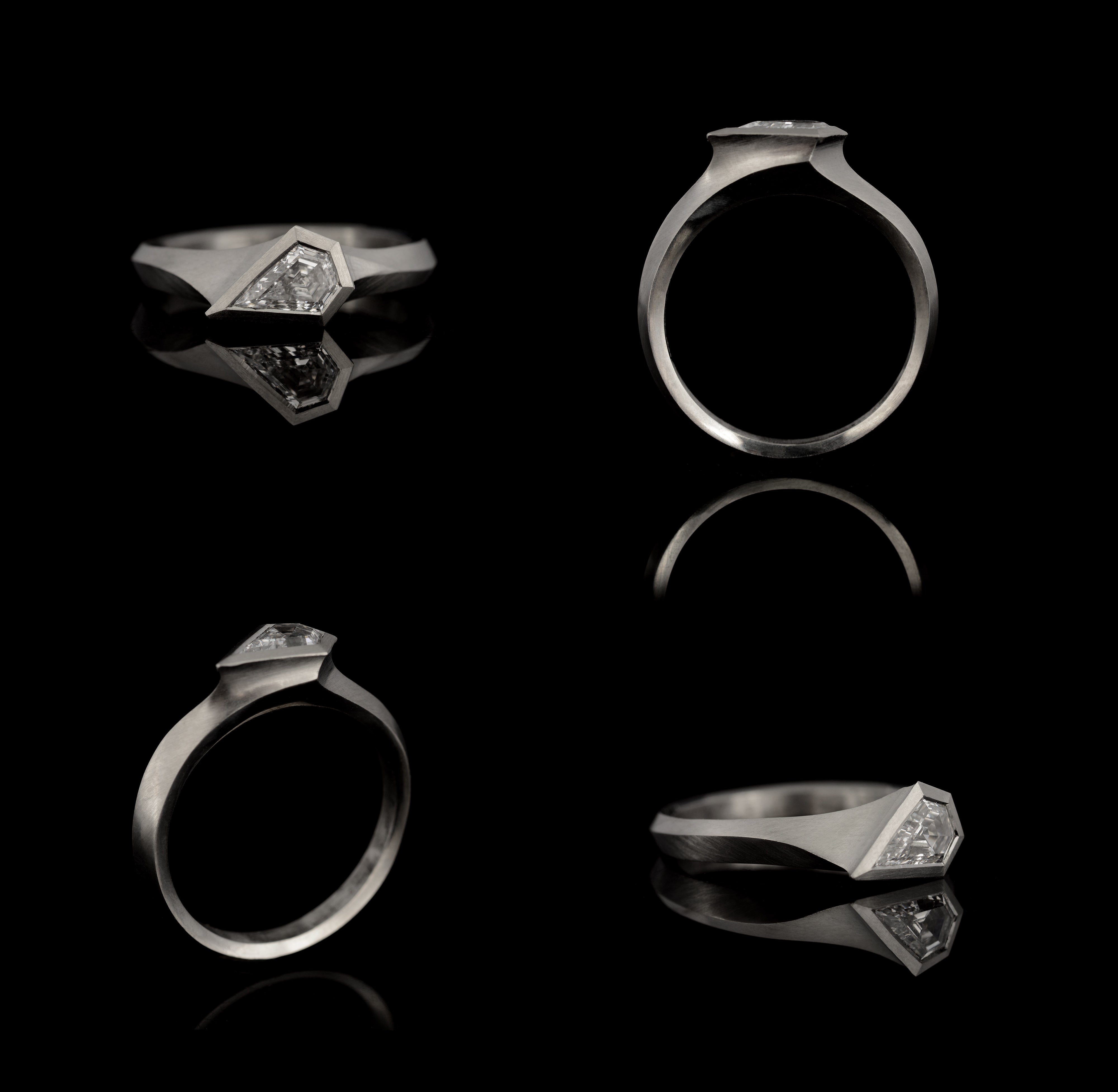 Named for the shield of Zeus in ancient mythology, which inspired the phrase "under the aegis of", meaning "under the protection of". The angular forms of our Aegis collection evokes feeling of protection and strength in the wearer. A modern take on classic solitaire engagement rings, first carved in wax, by hand, before being cast in precious metal. Designed and made to last for generations with a different point of interest when viewed from all angles.