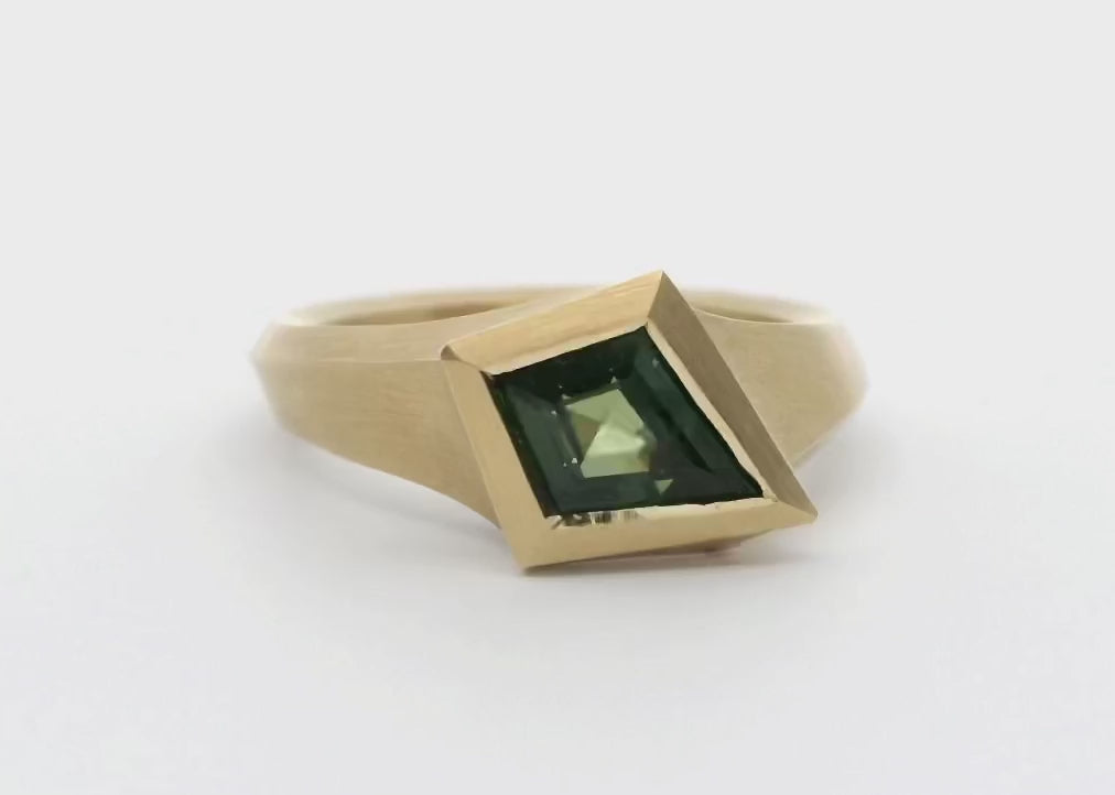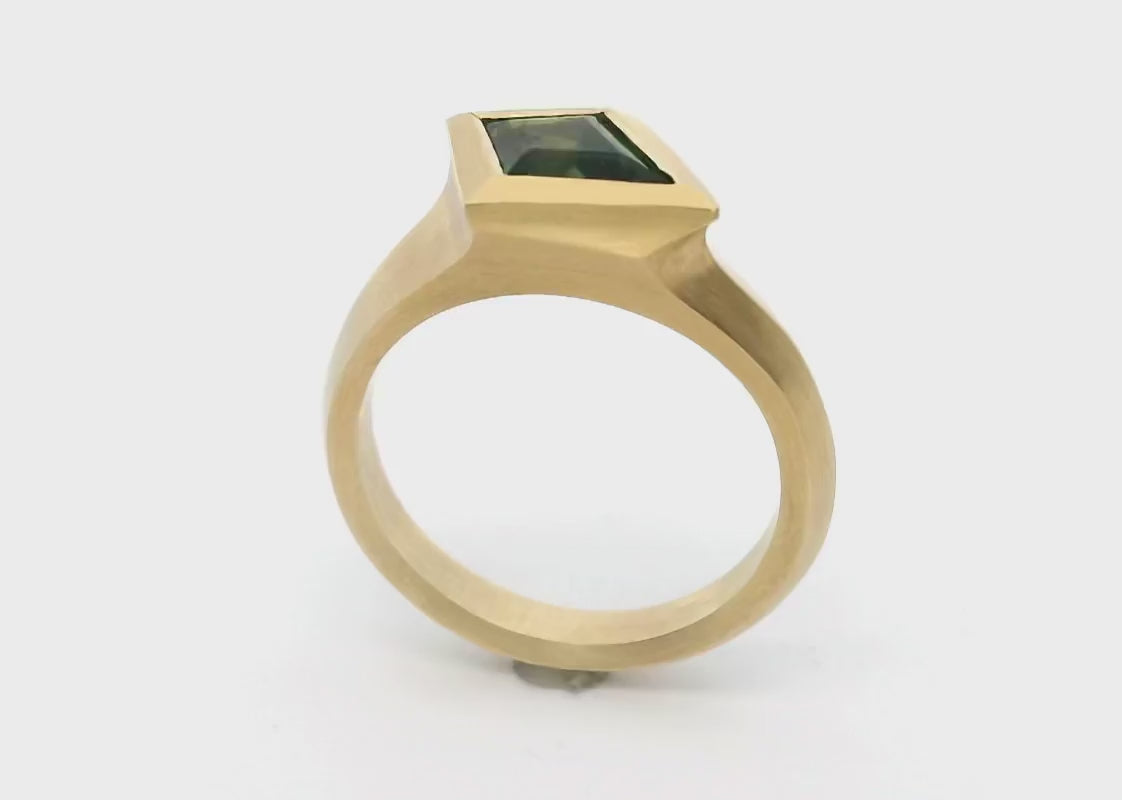 The kite shaped .95ct Australian sapphire has a subtle green and teal hue to it which catches the light beautifully. Our Aegis collection is a modern take on classic solitaire engagement rings, first carved in wax, by hand, before being cast in 18ct yellow gold.