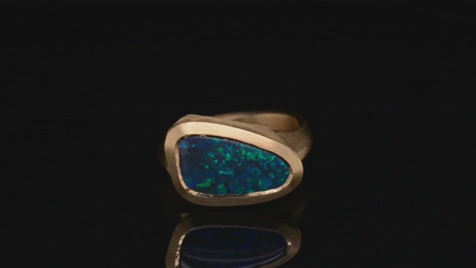 Hand-carved 18-carat yellow gold Arris cocktail ring set with a 2.43 carat freeform black opal. The opal's vivid blue and green hues contrast beautifully with rich yellow gold. This striking cocktail ring has fluid curves and soft angles created by hand carving that give the ring a sculptural quality. The gold is brushed to soft satin finish, with brightly burnished edges that emphasise the sculpted lines of the form.