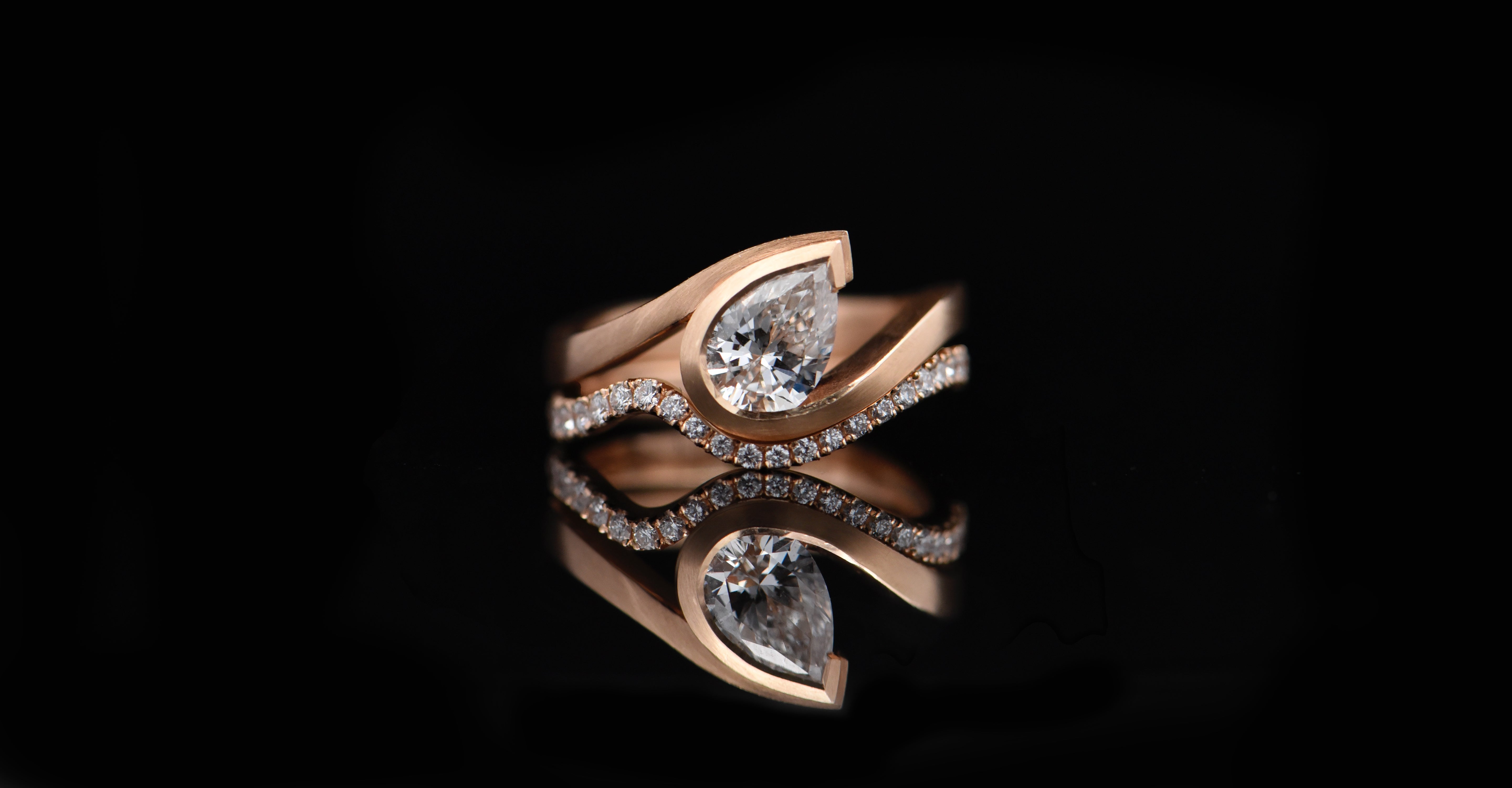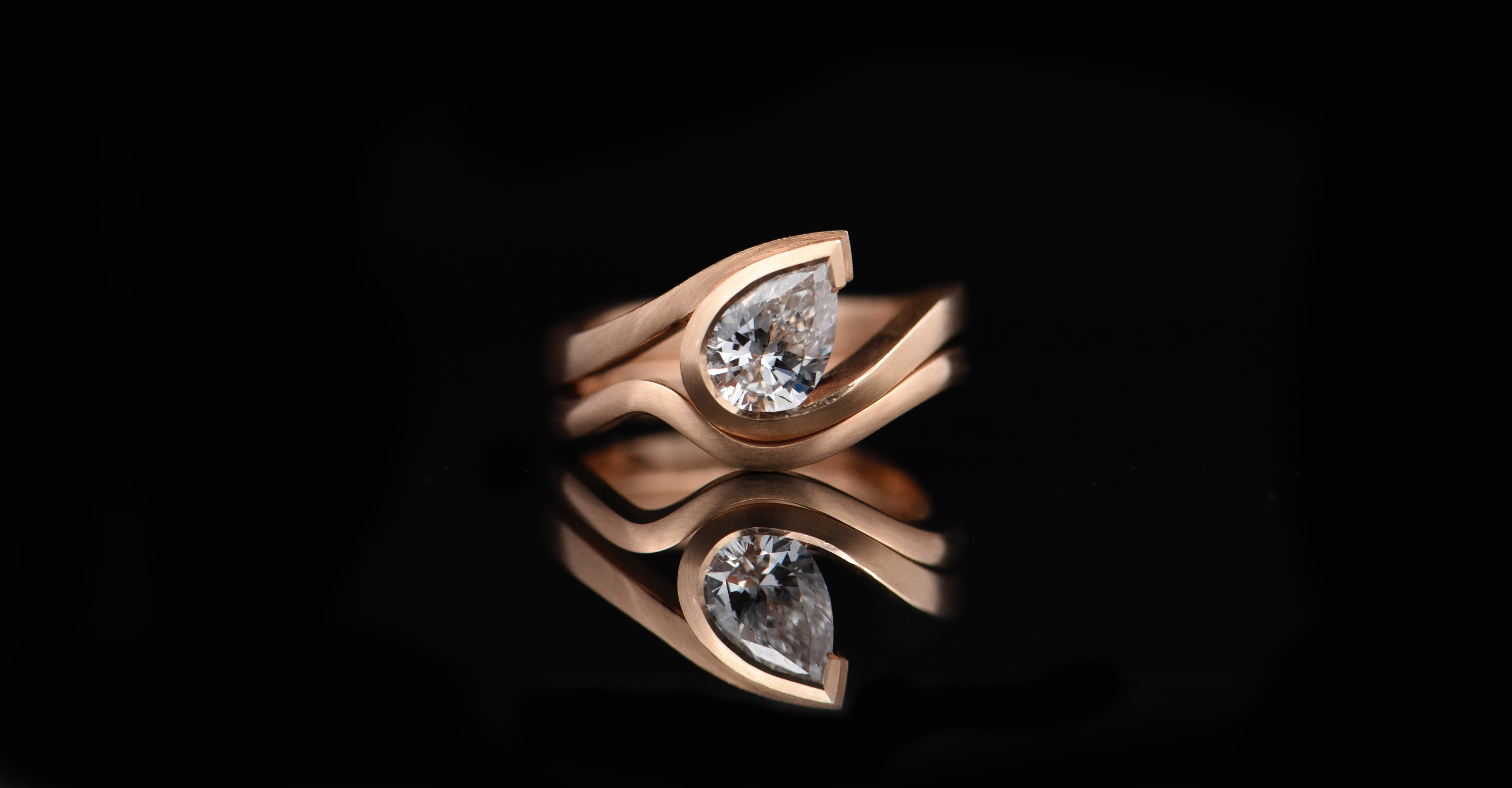 A matching fitted wedding band for our Balance engagement ring. Hand forged to follow to soft curves of the engagement ring. The band is half set with diamonds, highlighting the curves of the ring and accentuating the engagement ring's center stone.