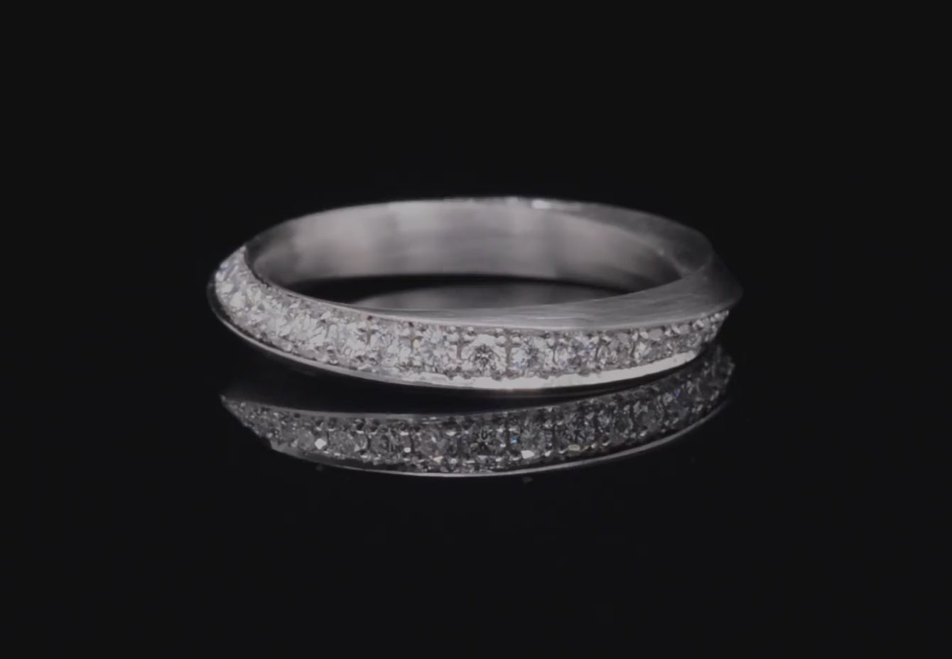 The Platinum Diamond Set Möbius Band is a contemporary and unusual women's eternity wedding ring with dainty white diamonds. The minimal form of this elegant and sculptural band is inspired by the Möbius strip. The continuous loop of this mathematical strip represents infinity, a sentiment which makes choosing it as a unique wedding ring even more meaningful.