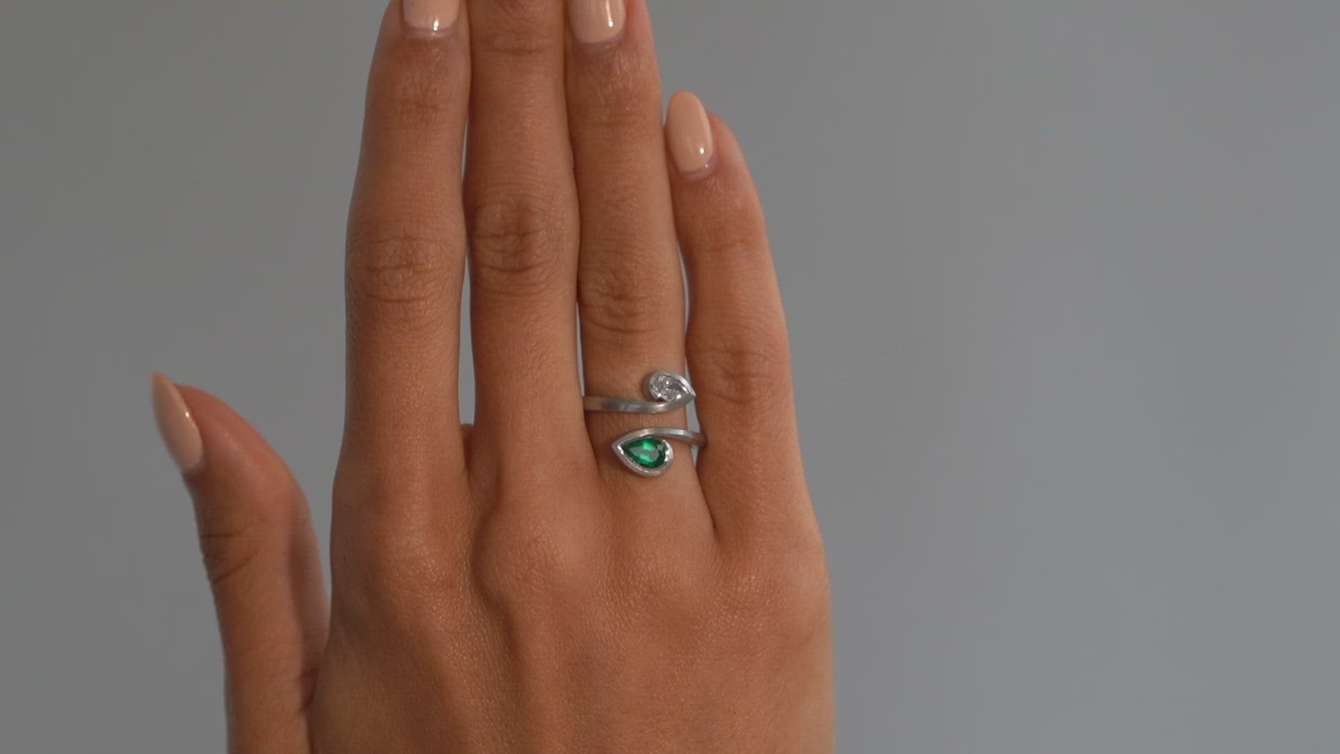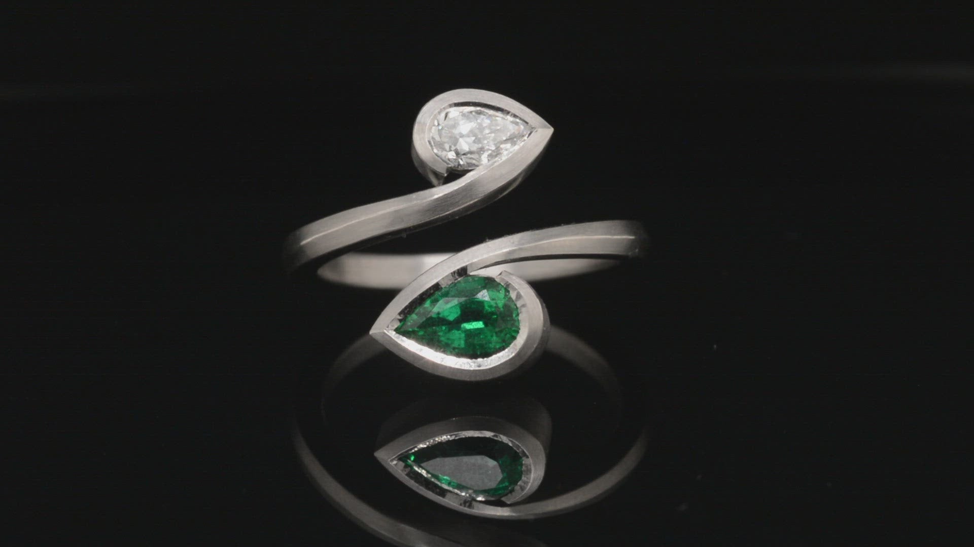 A refined, modern design. This stunning platinum ring is a take on our 'Twist' style. Bezel set with a pear-shaped .6ct emerald and .3ct white diamond, these sumptuous stones dance together to form a distinctive partnership of colour and light set among precious platinum. Using age-old goldsmithing techniques this ring is hand forged from platinum bar and given either a highly polished or brushed satin finish to create a modern classic. An instant hit with any jewellery lover.