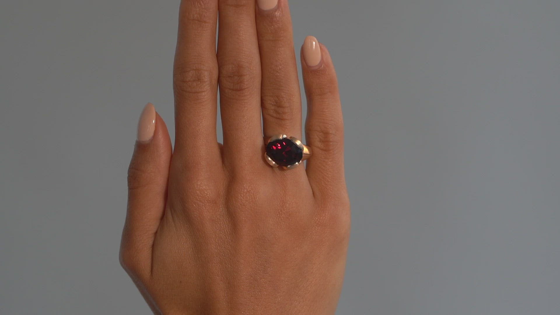 Carved by hand, this 18ct red gold umbalite garnet ring is one of a kind. The deep colour of the gemstone is enhanced by the warm red tones of the gold. At 7.95ct this unique gemstone is generously proportioned and its splendid red colour and unusual cut make it one in a million. Sculpted in wax to create fluid, asymmetric curves which complement the shape of the stone and highlighted with four brilliant white diamonds, one on either side and two beneath the centre stone to keep as the wearer's secret.