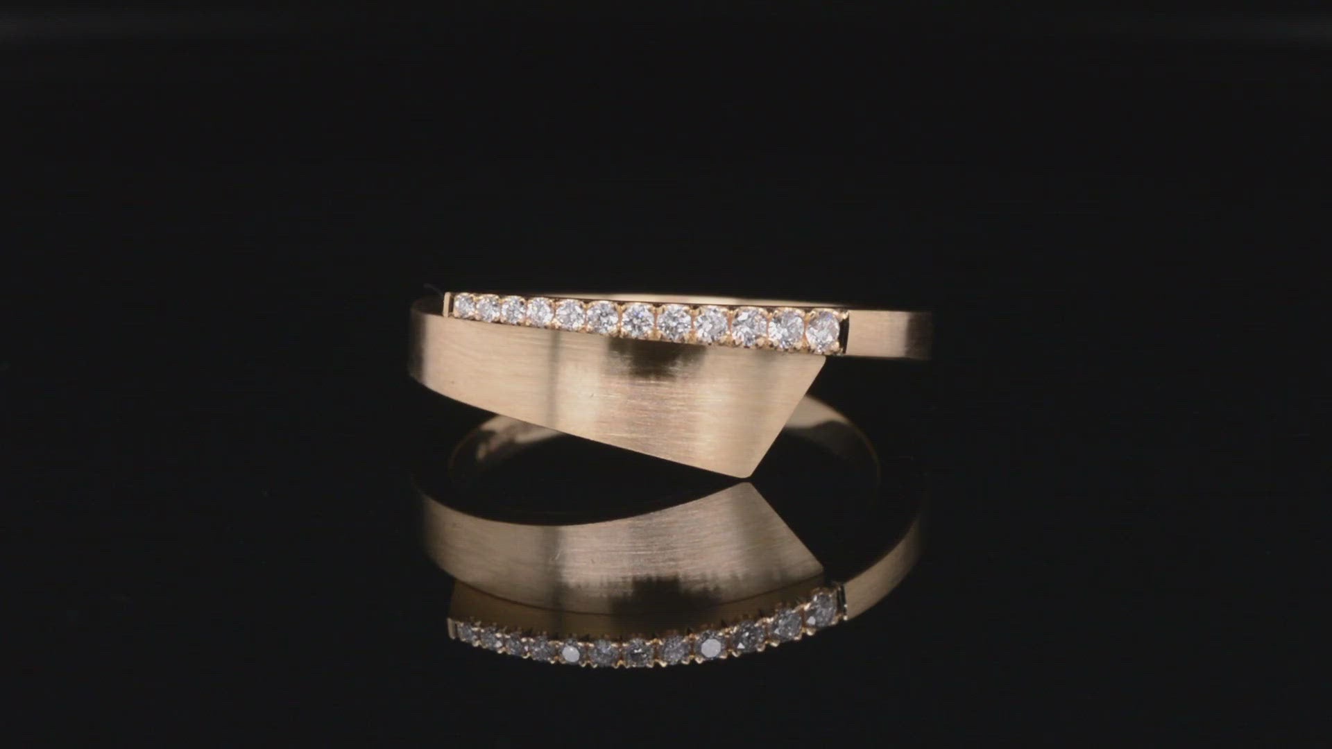 A strong, clean design. Hand forged 18 carat gold ring, made from a single piece of metal and castelle set with tapering white diamonds. In castelle setting, the stones come to the edge of the metal, so that only diamonds are visible when worn. This highly accurate, specialist setting technique is carried out in house, under microscope.