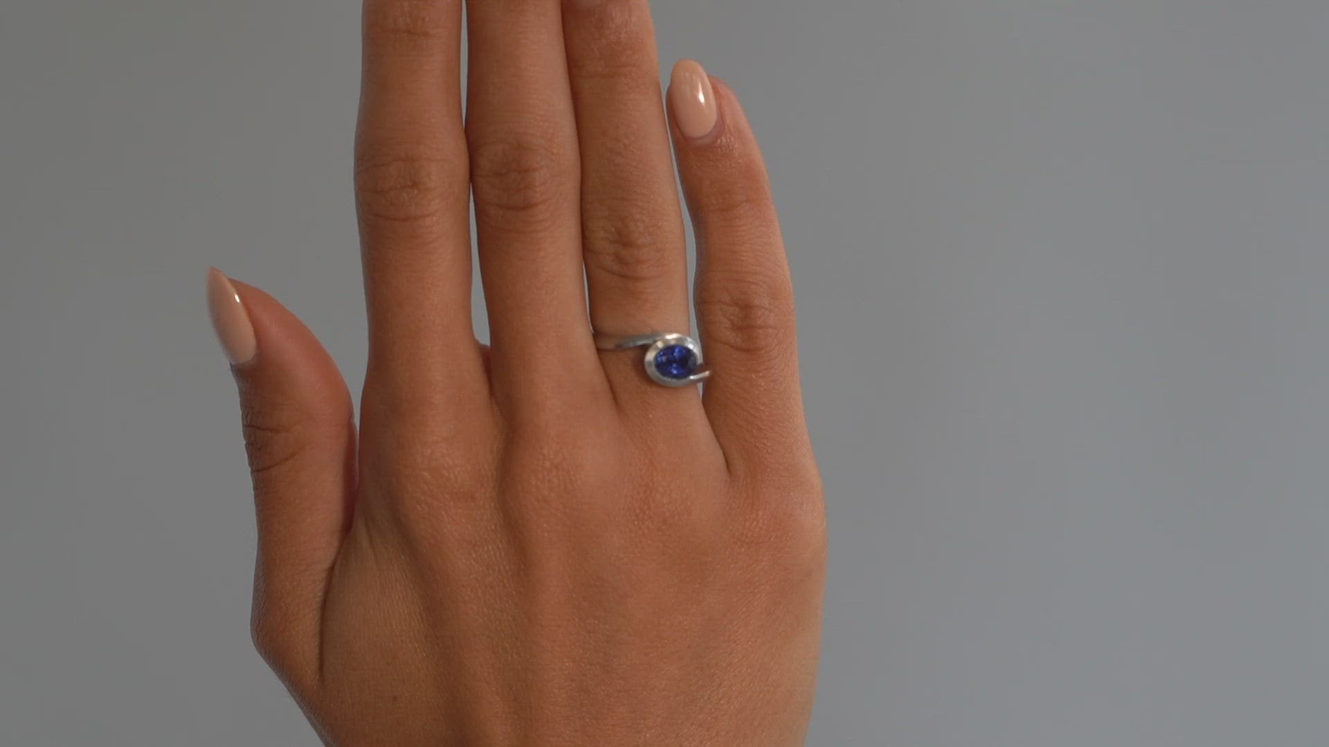 The Platinum Oval Blue Sapphire Wave Engagement Ring is the perfect alternative engagement ring idea for fashion-forward woman. Featuring a natural, 1.36ct oval deep blue sapphire set in our signature satin-finished platinum, this unique ring is an asymmetric and curvaceous solitaire engagement ring. The tapering lines of metal surround the shape of the sapphire gracefully.