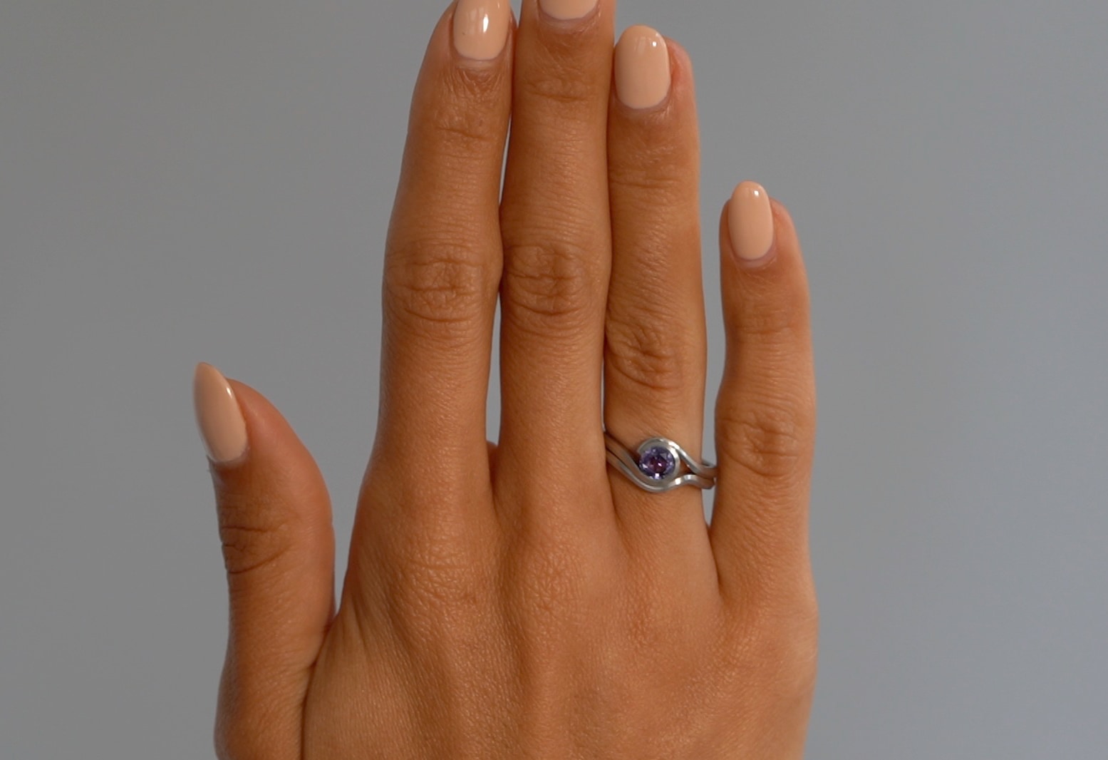 An asymmetric, curvaceous ring, the Platinum Violet Sapphire Wave Engagement Ring is the perfect alternative engagement ring idea. The focal point is the 0.57ct rose-cut violet sapphire which is set in our signature satin-finished platinum hand-forged band. This is a truly unique solitaire engagement ring, the tapering lines of metal surround the shape of the sapphire gracefully. It is pictured as part of a pair with a fitted platinum wedding band.