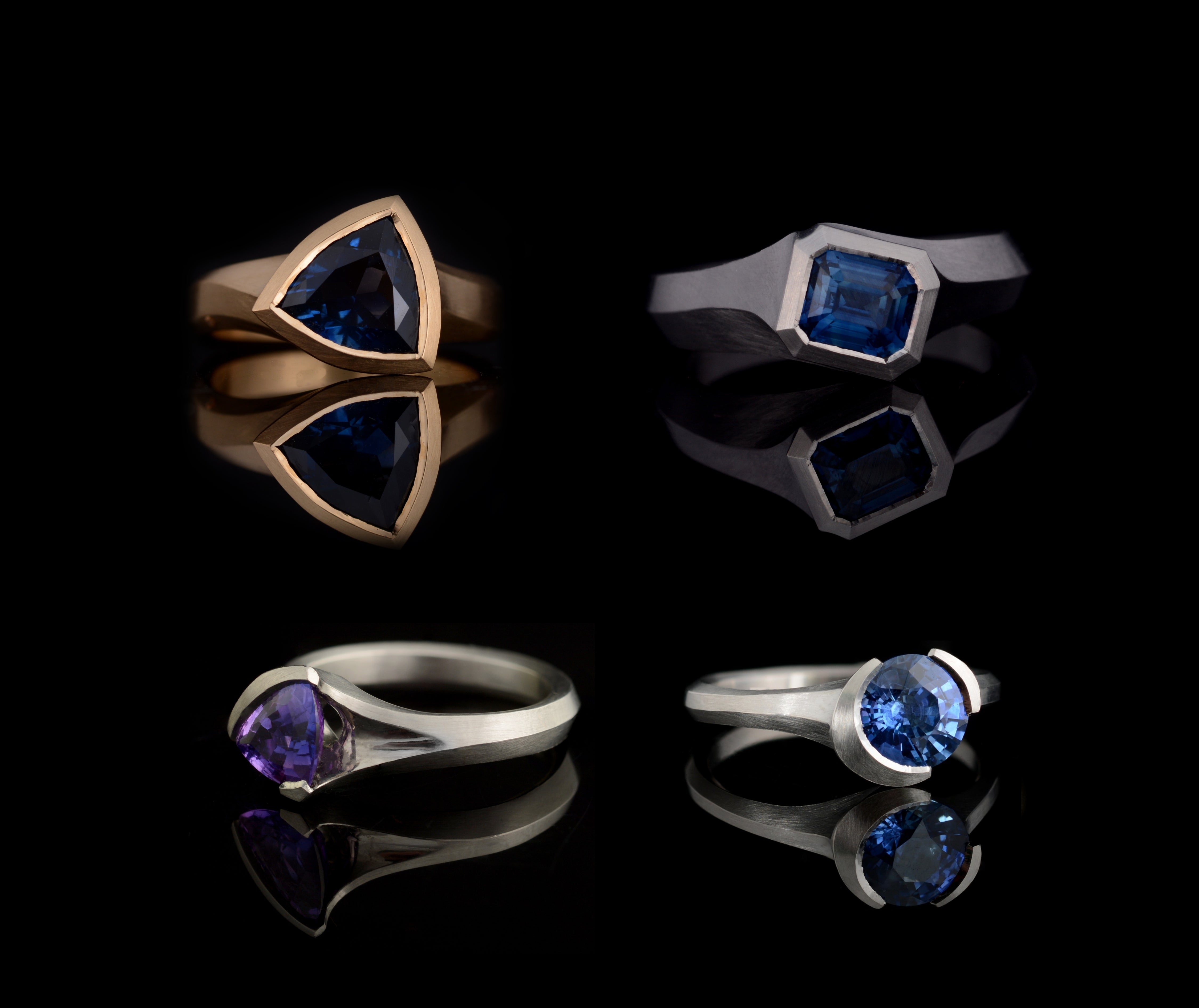 Sapphires come in a wide variety of colours but blue and purple shades are a favourite. We love using unusual shapes like trillion cuts in our Arris collection and these Sapphires worked wonderfully.