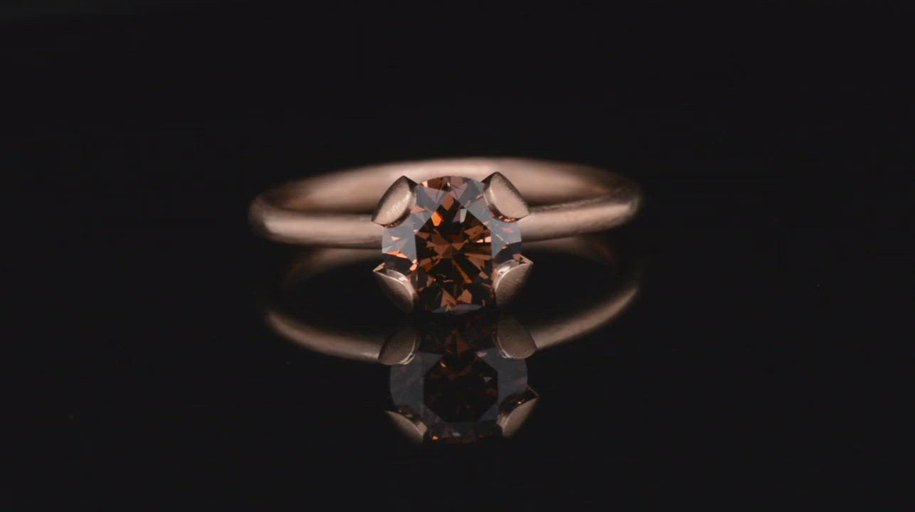 Enhanced by a soft satin finish the warm hue of rose gold compliments every skin colour. Tonally matched, the brilliant cut cognac coloured diamond looks great set with the rose gold of the ring.
