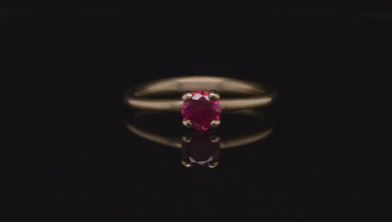 A sculpted variation on the classic four claw solitaire ring. Gently curved and sculpted claws give this ring an organic quality and bring a fresh, modern feel to a classic design. Seen here in satin-finished yellow gold, set with a round .5ct ruby.