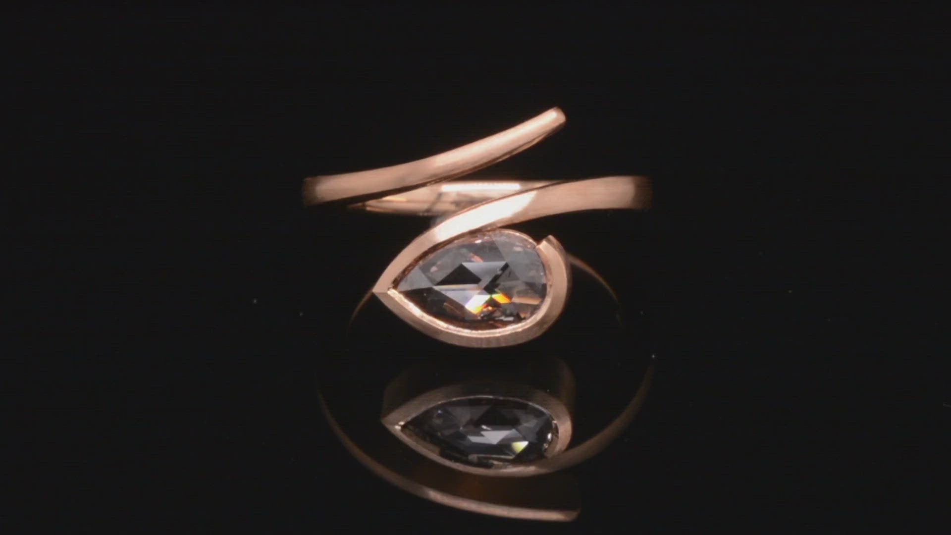 The 'Twist' rose gold and diamond engagement ring is a refined, contemporary design. Hand forged from 18ct rose gold bar, this show-stopper and unique engagement ring twists delicately around the finger to form a bezel setting for the diamond. This stunning ring is set with a .8ct pear shaped, rose-cut, cognac diamond and is available in either a brushed satin or high polish finish to create a modern classic.