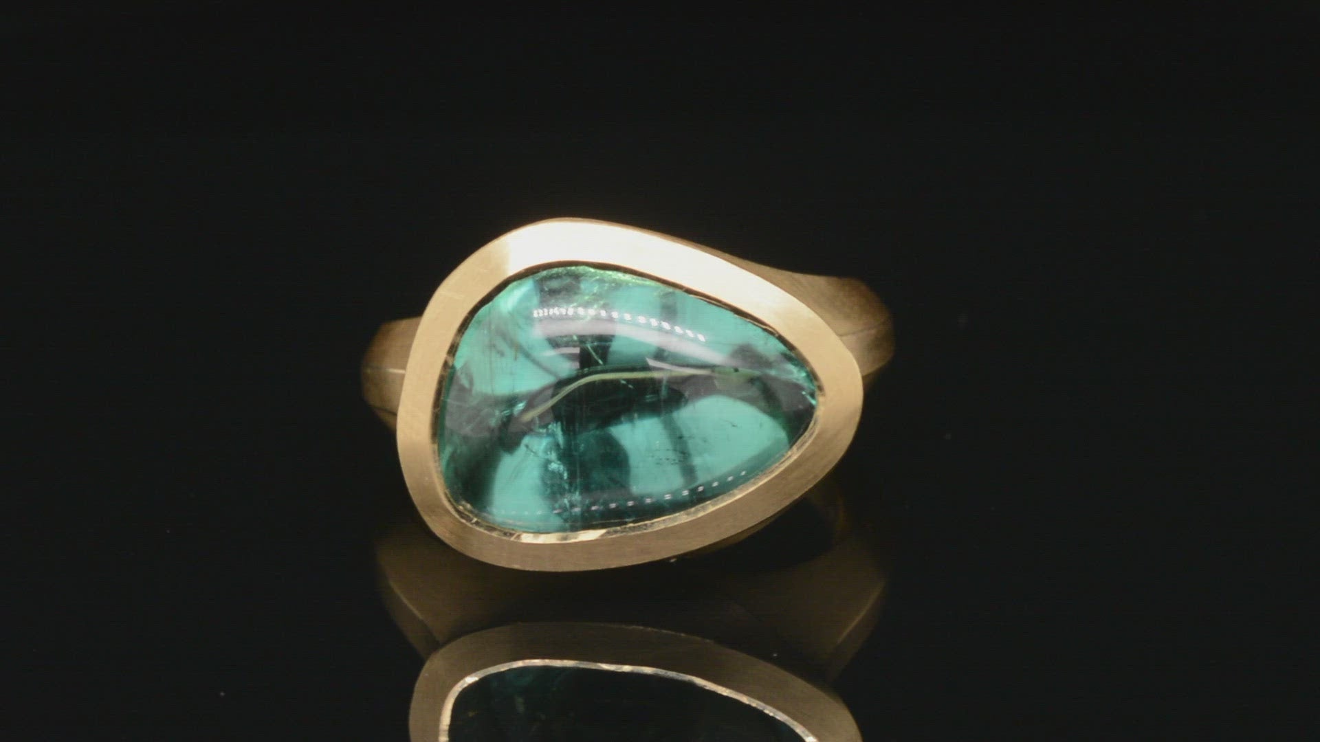 Satin finished yellow gold is paired with a 6.73ct cabochon cut tourmaline in this sculptural cocktail ring. Part of our Arris range, this ring is hand carved to fit its unique gemstone perfectly. The fancy cut tourmaline is a blue-green colour, which looks especially vibrant against the rich tones of 18 carat yellow gold.